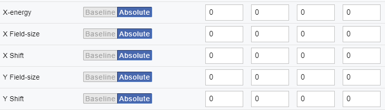 - If the FFF fields are not returning values and are coming in as all zeros, set the tolerances for X-energy and its associated values (X Field-size, X Shift, Y Field-size, Y Shift) as an absolute tolerance with a value of 0 as shown below: