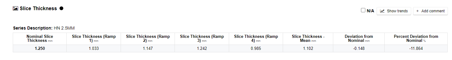 The slice thickness is measured for each ramp. The mean of all four ramps is compared to the nominal thickness from the DICOM header, and an absolute and percentage deviation is reported.