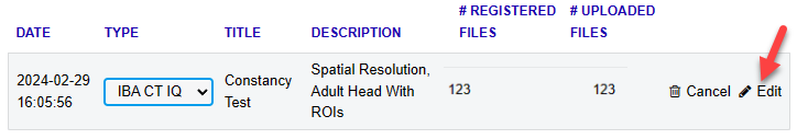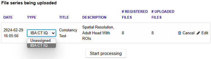 Once file series have been uploaded they will be displayed below the upload control. To remove a series from the queue click the Cancel button beside the series. To start processing click the Start Processing button. A description for the image series can be added at this point. Click the Edit button next to the series. Type a description for the series into the text box that appears below Description and either click Save or press the enter key. The description can also be edited after the images have been processed. Descriptions will appear in the report with the analysis of the series.