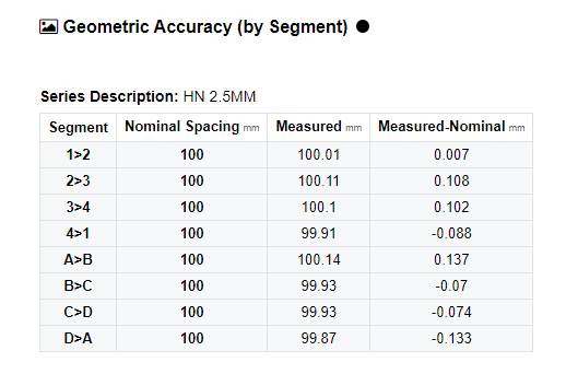 The thicker rods (5mm) are designated with the letters A, B, C, and D. The thinner rods are designated by the numbers 1 through 4. The nominal distance between the rods in each square is 100mm. The actual distance is measured and compared to the nominal distance for each side of the two sets.