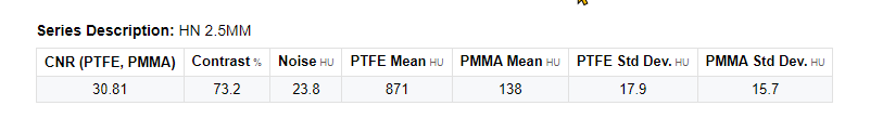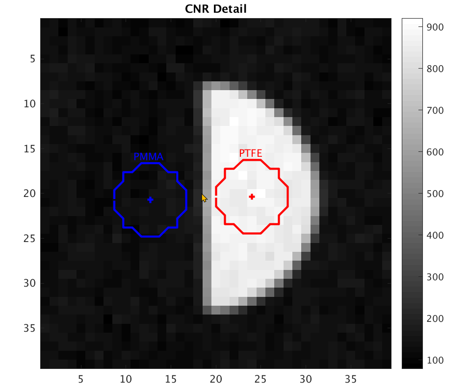 - High Contrast/Resolution: Contrast to Noise Ratio (the contrast-to-noise ratio between the PTFE object and PMMA background)