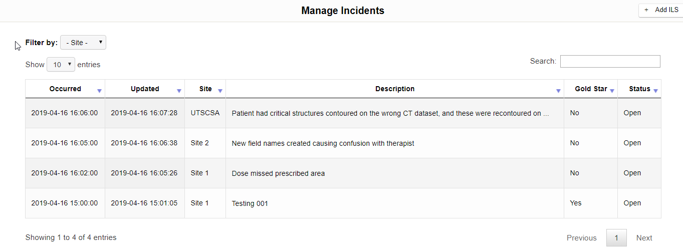 To view existing ILS incidents, click ILS on the left pane and then click the View incident list button in the upper left corner of the screen. Below is an example of the Manage Incidents screen: