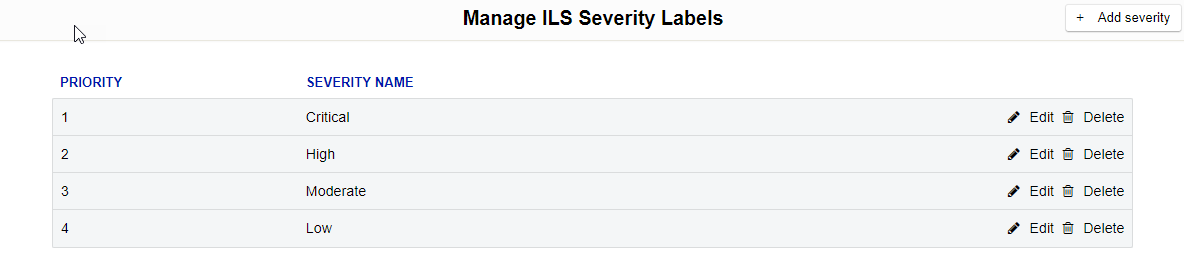 To manage ILS Severity Labels, click Manage on the main navigation pane and then click the Severities link. Below is an example of the Manage ILS Severity Labels screen: