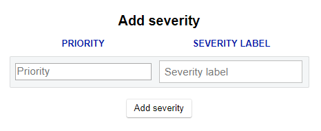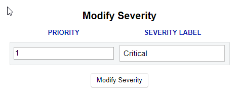 Click on the + Add severity button to add a new label or click the Edit button to edit an existing label. Either choice will display a similar popup where a new severity label can be edited or an existing severity label modified: