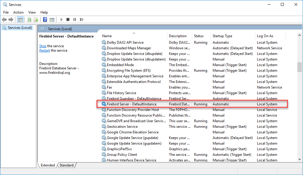 If you are using a Daily QA3 device and unable to connect, ensure that the Firebird Server is running from Windows Services. Open the Windows Services snap-in (on Windows 10 type "services" in the search bar) on the computer where Equipment Hub is installed, right-click on the Firebird Server service, and note the status. If Firebird Server is not running, right click on the service and click “Restart”.