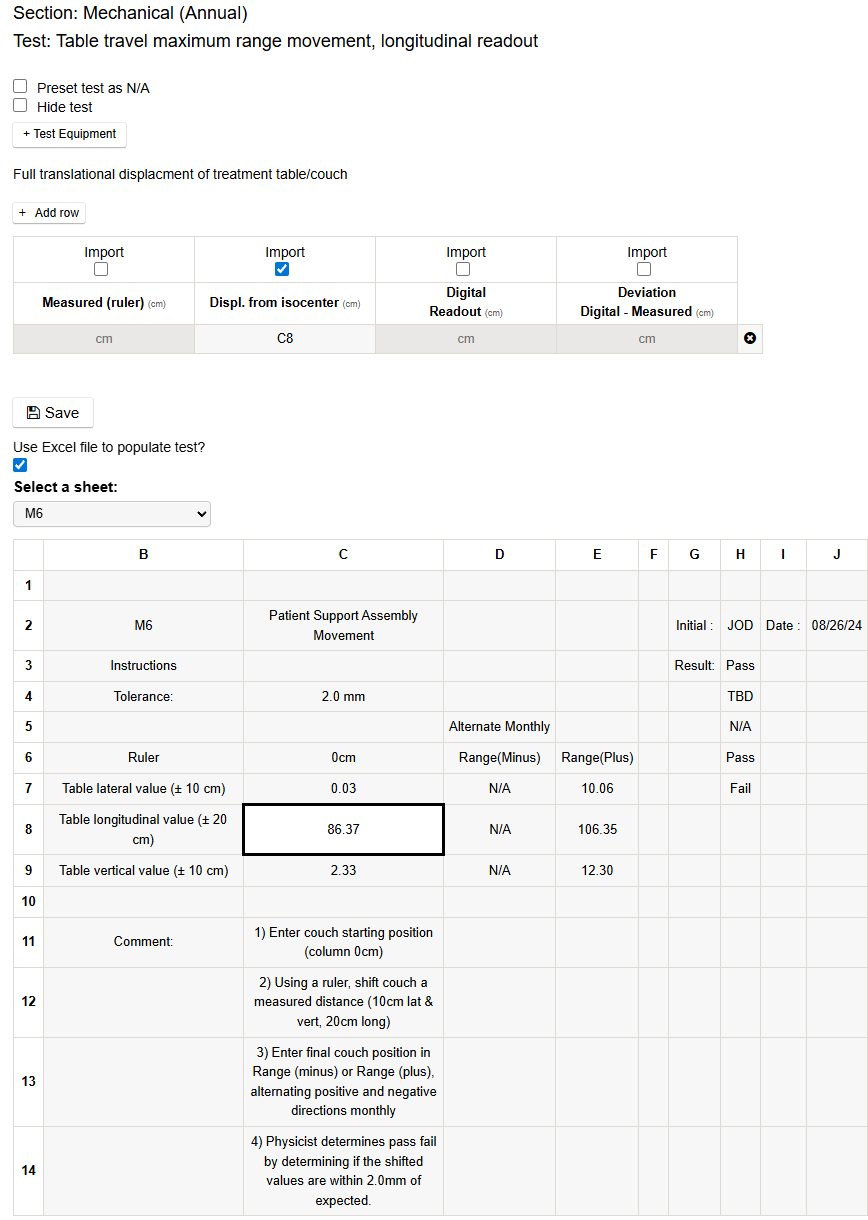 Result stored in an Excel spreadsheet may be imported into a specific test measurement or meta-item. To do this individual test cells will need to be mapped to a specific sheet and cell. Once the mapping is complete, a spreadsheet may be uploaded into the new QA and the results will be imported based on the mappings set in the schedule configurations. Note the sheet name and cells must be exactly the same as the mappings and the cell contents must match the format of the test cell. For example, text cannot be imported into a numeric cell.