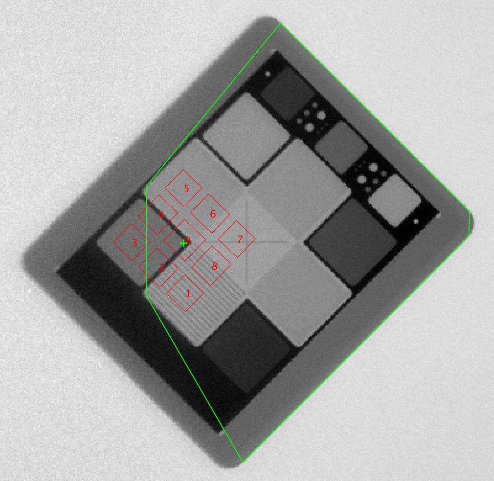 Various factors including scan parameters and artifacts can lead to the misidentification of ROIs in Planar kV and MV imaging tests. The image below shows a case in which the boundaries of a Sun Nuclear planar imaging phantom are misidentified (as shown in the green outline), as well as the kV imaging ROIs themselves (outlined in red).