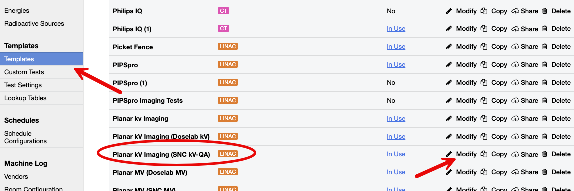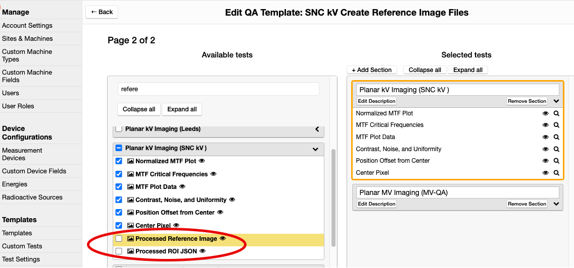 In your Planar kV or MV template, you will need to add the two specific tests that will generate and display the required reference files. First, find the template that will run the required kV or MV Imaging test. Per the image below, modify this template to add the tests.