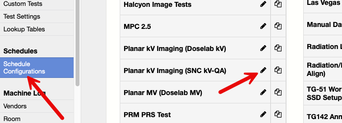 Now modify your Planar kV or MV schedule to include the reference files. Navigate to Manage - Schedule Configurations, and find the schedule your QA uses. Click the pencil icon to edit the schedule.