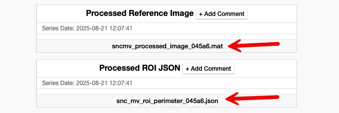 To generate the reference files, run a new QA with the image file containing the correct ROIs. This new QA will output the two files required for proper ROI identification. Click each file name to download the .mat and .json files.