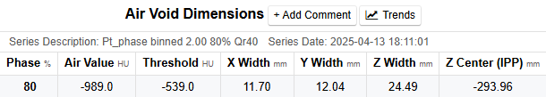 - Z Center (IPP): The interpolated center in mm of their void’s z profile using the Image Position Patient DICOM tags of the slices.