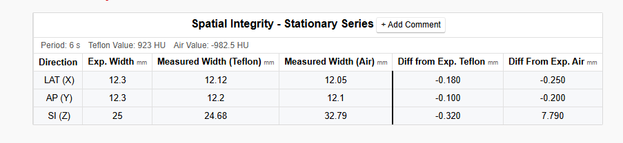 - Measured Width (Air Stationary): The measured dimensions of the Catphan air void in the stationary image set in mm.