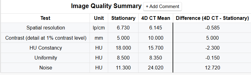 - HU Constancy: Max absolute difference from expected CT numbers for air (-1000 HU), LDPE (-100 HU), and acrylic (120 HU).