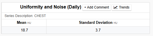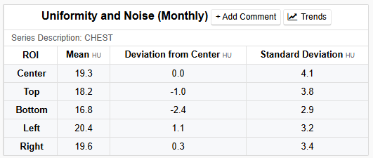 The means for the top, right, bottom, and left ROI is compared to the mean for the center ROI and the difference is reported along with the standard deviation (noise) for each ROI.