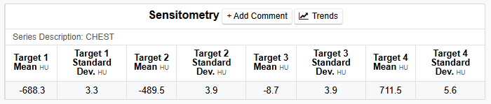 Mean pixel values and standard deviations are reported for the center, top, right, bottom, and left ROIs as shown in the figure below. The center of each ROI is marked with the plus sign.