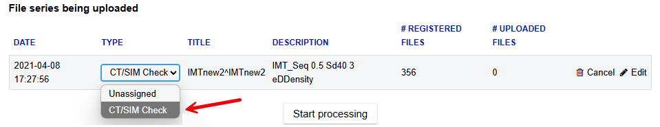 Once file series have been uploaded they will be displayed below the upload control. To remove a series from the queue click the Cancel button beside the series. To start processing click the Start Processing button. A description for the image series can be added at this point. Click the Edit button next to the series. Type a description for the series into the text box that appears below Description and either click Save or press the enter key. The description can also be edited after the images have been processed. Descriptions will appear in the report with the analysis of the series.