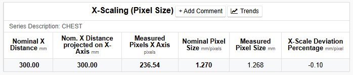 The next table reports on the pixel spacing and assumes the distance matches the nominal X distance (the expected distance specified by the phantom manufacturer). For the table below the following is how each column heading should be interpreted: